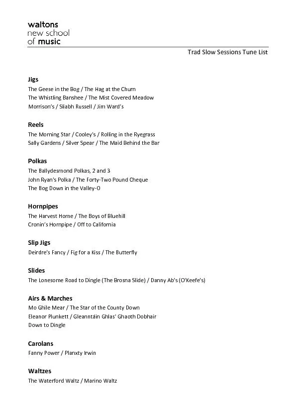 Download Presentation The PPT/PDF document "SessionsTuneList" is the property of its rightful owner. Permission is granted to download and print the materials on this website for personal, non-commercial use only, and to display it on your personal computer provided you do not modify the materials and that you retain all copyright notices contained in the materials. By downloading content from our website, you accept the terms of this agreement.