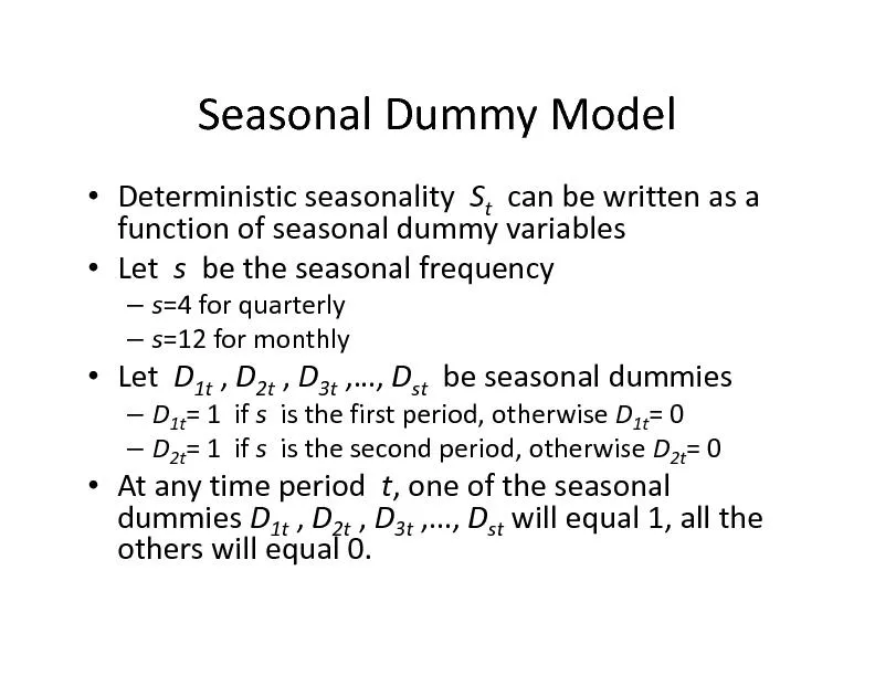 DummyDeterministicdummyvariablestiftifJanuarytif EstimationLeastsquaresregressionYoucanRegressomittinginterceptRegressinterceptomittingdummyegYoucannotregressinterceptfortheywouldcollinearredundant