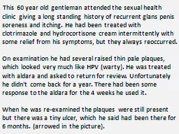 year old gentleman attended the sexual health clinic giving a long standing history of recurrent glans penis soreness and itching He had been treated with clotrimazole