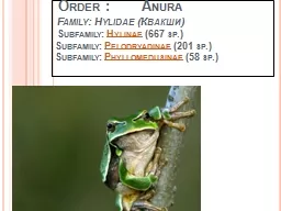 Amphibia Order Anura Family Hylidae Квакши Subfamily Hylinae 667 sp Subfamily Pelodryadinae 201 sp Subfamily Phyllomedusinae 58 sp