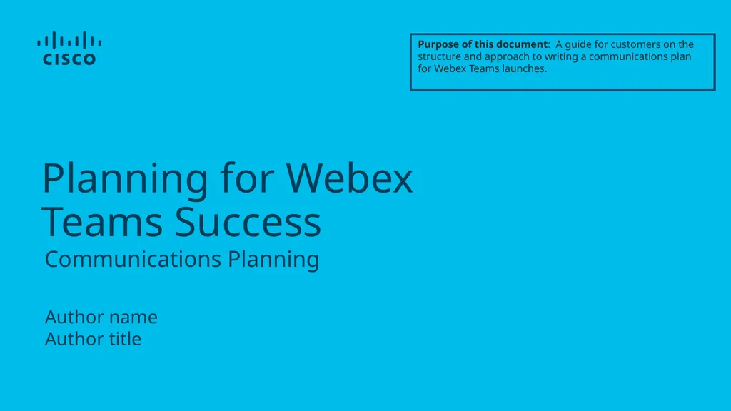 Description: Author name Author title Communications Planning Planning for Webex Teams Success Purpose of this document: A guide for customers on the structure and approach to writing a communications plan for Webex Teams launches. Find your channelsDownload Presentation The PPT/PDF document "" is the property of its rightful owner. Permission is granted to download and print the materials on this website for personal, non-commercial use only, and to display it on your personal computer provided you do not modify the materials and that you retain all copyright notices contained in the materials. By downloading content from our website, you accept the terms of this agreement.