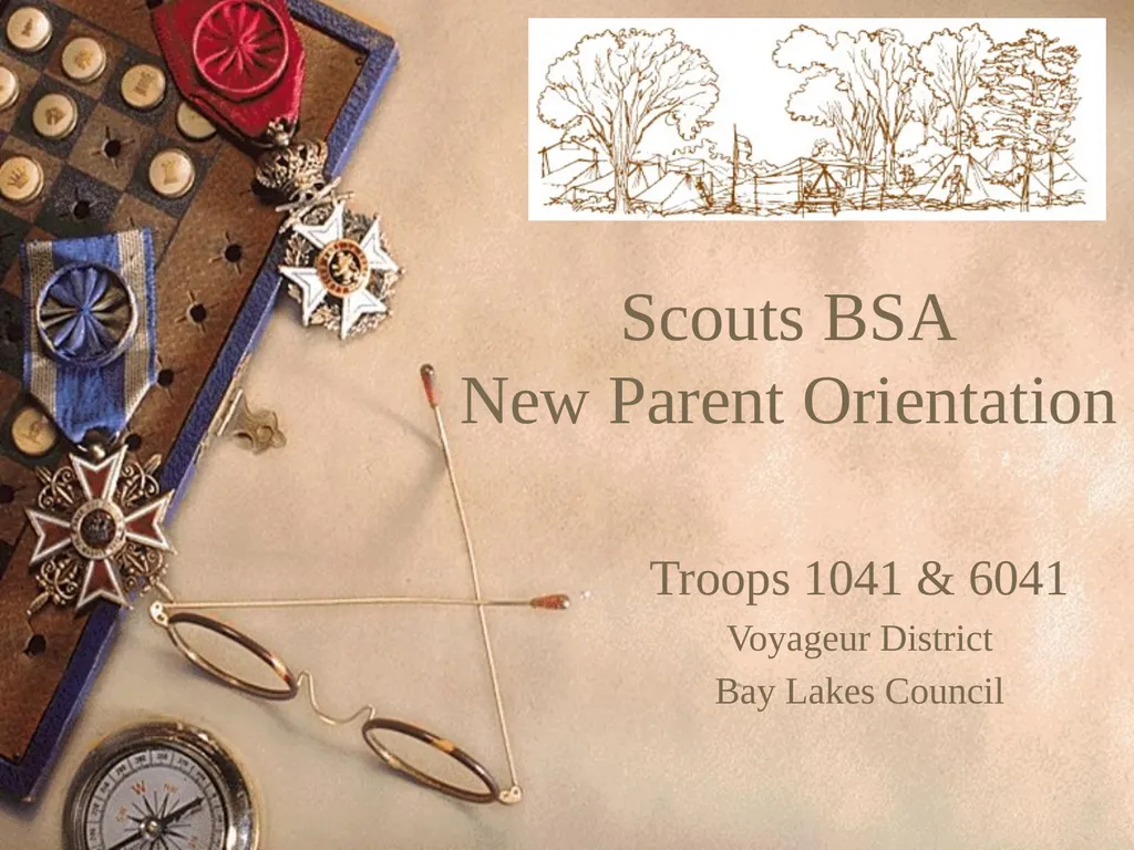 Description: Scouts BSA New Parent Orientation Troops 1041 6041 Voyageur District Bay Lakes Council Agenda The Goals of Scouting History History of Scouting History of Troop 1041 6041 Organization BSA Organizational Overview Cub ScoutScouts BSADownload Presentation The PPT/PDF document "" is the property of its rightful owner. Permission is granted to download and print the materials on this website for personal, non-commercial use only, and to display it on your personal computer provided you do not modify the materials and that you retain all copyright notices contained in the materials. By downloading content from our website, you accept the terms of this agreement.